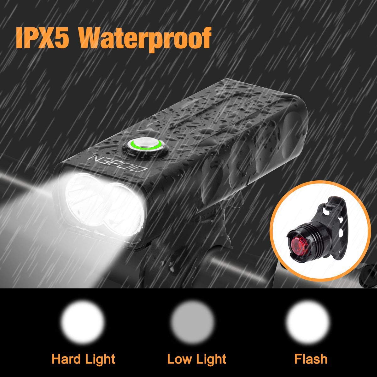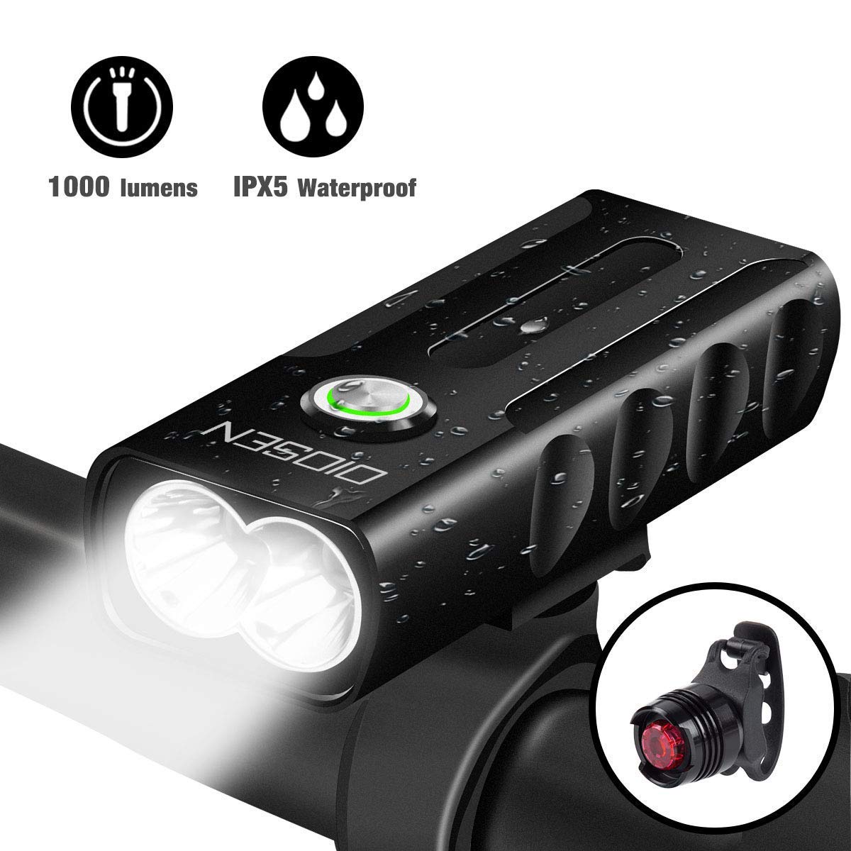 OIOSEN Juego de Luces para bicicleta, Lámpara de bicicleta de 1000 lúmenes recargable mediante USB, Lámparas delanteras y traseras, Linterna de seguridad a prueba de agua para ciclismo, cámping, senderismo